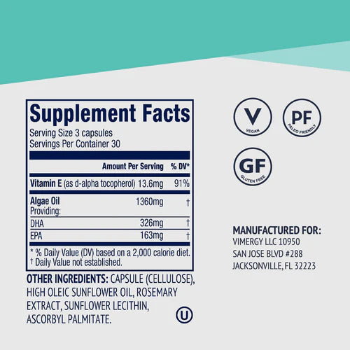 Proporciona una excelente fuente de vitamina E – Las cápsulas veganas de EPA/DHA de Vimergy son una forma rápida y conveniente de obtener una dosis diaria del poderoso antioxidante vitamina E.